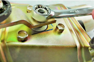 6. Накидным ключом на 10 мм отворачиваем три болта крепления мотор-редуктора к кронштейну.