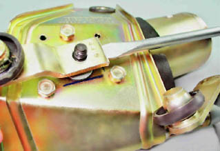 Сборка 1. Вставляем валы рычагов в кронштейн в последовательности, обратной разборке (не забывая про верхние и нижние регулировочные шайбы). 2. Крепим мотор-редуктор к кронштейну. 3. Если двигатель мотор-редуктора был заменен новым или проверялся на вращение в снятом состоянии, то до установки, необходимо его вал установить в исходное положение. Для этого, подсоединяем мотор-редуктор к бортовой сети автомобиля через колодку разъема. Кратковременно включаем стеклоочиститель. После того, как мотор-редуктор, отработав полный цикл, остановится, отсоединяем его от сети. 4. Кривошип устанавливаем на вал мотор-редуктора в соответствии с нанесенной на кронштейн меткой. Накидным ключом на 13 мм заворачиваем гайку крепления рычага.