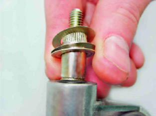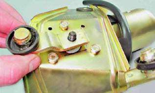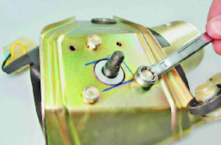 7. Снимаем мотор-редуктор с кронштейна. Смазка 8. Валы рычагов щеток крепятся в кронштейне при помощи Е-образной стопорной шайбы, установленной в проточке оси. Вставляем тонкую шлицевую отвертку в отверстие стопорной шайбы и, поворачивая отвертку вокруг оси, снимаем стопорную шайбу.