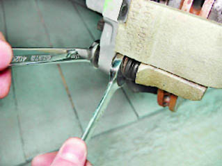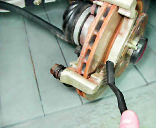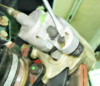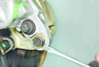 7. Вынимаем тормозной шланг из кронштейна стойки. 8. Удерживая от вращения направляющий палец рожковым ключом на 17 мм, ключом на 13 мм отворачиваем его болт.