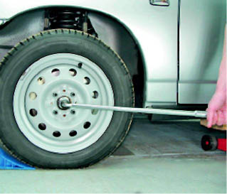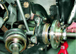 4. Подкладываем противооткатные упоры под передние колёса автомобиля. 5. Постукивая по кернеру молотком отгибаем замятый в проточки вала привода край гайки (в двух местах) (см. 10.2.2, п. 4). 6. Торцовым ключом на 30 мм с длинным воротком ослабляем затяжку гайки ступицы переднего колеса.