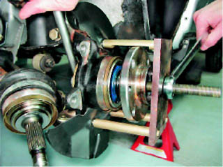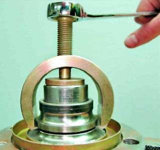 Предупреждение! При запрессовке ступицы силовой болт должен опираться только на внутреннее кольцо подшипника. 5. Приспособлением запрессовываем ступицу во внутреннее кольцо подшипника.