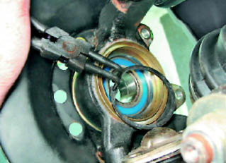 15. С обратной стороны поворотного кулака щипцами снимаем внутреннее стопорное кольцо подшипника ступицы.