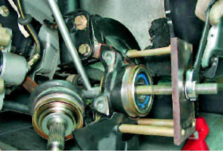 7. Снимаем переднее колесо (см. 10.3.3) и отворачиваем гайку ступицы. 8. Снимаем суппорт тормозного механизма, не отсоединяя от него тормозной шланг (см. 12.2.4) 9. Снимаем тормозной диск (см. 12.2.4). 10. Отворачиваем два болта крепления шаровой опоры к поворотному кулаку (см. 10.1.1, п. 4). 11. Отворачиваем на несколько оборотов гайки крепления верхней опоры стойки к кузову (см. 10.1.2, п. 4). 12. Отжав нижний рычаг подвески вниз, отводим нижний конец стойки в сторону и выводим из ступицы шлицевой наконечник наружного ШРУСа (см. 9.3.1, п. 11). 13. Уперев лапы съемника в поворотный кулак, вращая гайку болта выпрессовываем ступицу из поворотного кулака. Предупреждение! Усилие силового болта должно прикладываться к торцевой поверхности ступицы, а не к кольцу подшипника.