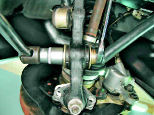 7. Чтобы при установке рычага сохранить прежнюю регулировку угла продольного наклона оси поворота, подсчитайте и запишите количество регулировочных шайб находящихся на заднем конце продольной растяжки.