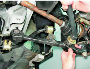 Поперечный рычаг подвески - снятие и установкаДля выполнения работы потребуется: - яма или эстакада (желательно); - бородок. Снятие 1. Подготавливаем автомобиль к выполнению работы (см. 5, п. 2б и 4). 2. Снимаем переднее колесо (см. 10.3.3). 3. Снимаем брызговик двигателя (см. 14.1.2). 4. Отворачиваем два болта крепления шаровой опоры к поворотному кулаку (см. 10.1.1, п. 4). Предупреждение! Вынимая болт, соблюдайте осторожность, стабилизатор находится в напряженном состоянии. 5. Вынимаем болт крепления стойки стабилизатора к рычагу (см. 10.1.9, п. 3 и 4). 6. Двумя ключами на 19 мм отворачиваем гайку болта крепления поперечного рычага к кронштейну кузова, вынимаем болт и выводим конец рычага из кронштейна.