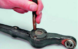 Поперечный рычаг подвески - замена резинометаллических шарнировРезинометаллические шарниры заменяем при проворачивании шарнира в рычаге, потере эластичности, выкрашивании или выдавливании резинового элемента шарнира из посадочного места. Для выполнения работы потребуется съемник чашечный универсальный (см. 4.2, п. 15). Снятие 1. Снимаем поперечный рычаг подвески с автомобиля (см. 10.1.5). Резинометаллический шарнир (РМШ) наружного конца рычага (соединения рычага с продольной растяжкой) состоит из двух отельных частей. Для снятия РМШ наружного конца рычага: 2. Зажимаем рычаг в тисках и тонким зубилом отгибаем края наружного металлического кольца одной из половин шарнира.