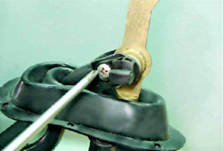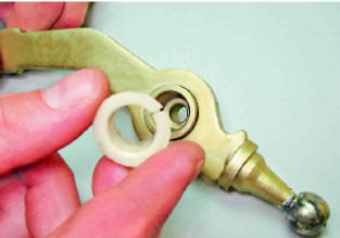 4. Если ось рычага проворачивается и гайку отвернуть не получается, то поддев отверткой, снимаем с оси пластмассовый ограничитель.
