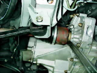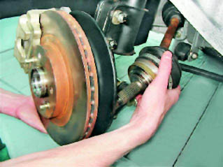 Привод ведущего колеса - снятие и установкаДля выполнения работы потребуются: - смотровая яма или эстакада; - новая гайка ступицы; - стопорное кольцо хвостовика внутреннего шарнира. Снятие 1. Подготавливаем автомобиль к выполнению работы (см. 5, п. 1 и 2б). 2. Снимаем брызговик двигателя (см. 14.1.12). 3. Сливаем масло из коробки передач (см. 9.2.3). 4. Снимаем декоративный колпак колеса, снимаем крышку ступицы и ослабляем затяжку гайки ступицы (см. 10.1.4, п. 2). 5. Ослабляем затяжку болтов крепления колеса (см. 10.3.3, п. 4). 6. Устанавливаем автомобиль на надежную подставку (см. 4, п. 2) и снимаем переднее колесо (см. 10.3.3, п. 8). 7. Ослабляем затяжку трех самоконтрящихся гаек крепления верхней опоры стойки подвески и отворачиваем гайки на несколько оборотов (см. 10.1.2, п. 5). 8. Торцовым ключом на 17 мм отворачиваем два болта крепления шаровой опоры к поворотному кулаку (см. 10.1.2, п. 6 и 7). 9. Торцовым ключом на 30 мм отворачиваем гайку ступицы колеса. 10. При необходимости при помощи универсального трехзахватного съемника выпрессовываем шлицевой наконечник наружного шарнира из ступицы (см. 10.1.4, п. 10) Замечание: При снятии левого привода поворачиваем рулевое колесо до упора вправо; при снятии правого привода поворачиваем рулевое колесо до упора влево. 11. Вынимаем тормозной шланг из кронштейна на стойке подвески. Осторожно, не допуская сильного натяжения тормозного шланга, оттягиваем нижнюю часть стойки наружу, извлекаем шлицевой хвостовик наружного шарнира из ступицы и аккуратно опускаем привод на поперечный рычаг подвески.