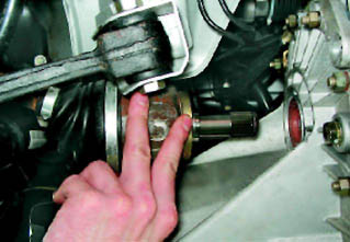Установка 1. Заменяем стопорное кольцо шлицевого хвостовика внутреннего шарнира новым. 2. Наносим пластичную смазку на шлицевую и гладкую поверхность хвостовика. 3. Аккуратно вставляем хвостовик в сальник, стараясь не повредить шлицами вала рабочую кромку сальника. При этом направляем стопорное кольцо зазором вверх. 4. Энергично вставляем привод в коробку передач и обязательно убеждаемся, что стопорное кольцо хвостовика внутреннего шарнира надежно зафиксировалось и привод не выдвигается из картера коробки передач. 5. Дальнейшую работу выполняем в обратной последовательности. Предупреждение! При сборке устанавливаем новую гайку ступицы. |