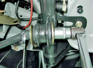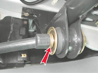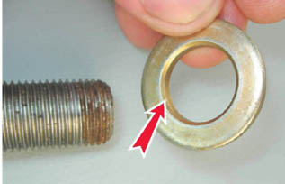 4. Снимаем с растяжки упорную шайбу и извлекаем передний конец растяжки из резинометаллического шарнира поперечины. 5. Снимаем с растяжки регулировочные шайбы. Установка Устанавливаем продольную растяжку в обратной последовательности. Отверстие регулировочной шайбы с одной стороны имеет фаску. При установке регулировочных шайб фаска должна быть направлена в сторону изгиба продольной растяжки.