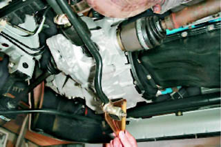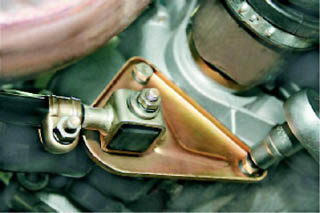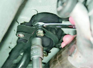 5. Торцовым ключом на 13 мм отворачиваем два болта крепления кронштейна тяги к коробке передач.