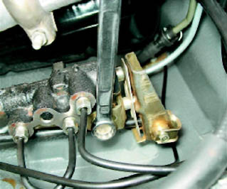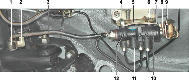 Регулятор давления жидкости в задних тормозных механизмах: 1 - серьга крепления упругого рычага к заднему мосту; 2 - фиксатор упругого рычага в серьге; 3 - упругий рычаг; 4 - кронштейн крепления регулятора; 5 - выступ регулировочного кронштейна пластины; 6 - болт (передний) крепления регулятора и регулировочной пластины; 7 - регулировочный кронштейн пластины; 8 пластина; 9 - рычаг; 10 - регулятор; 11 - контрольное отверстие закрытое заглушкой; 12 - стрелка на корпусе регулятора указывающая направление потока жидкости в подсоединяемой трубке5. Накидным ключом на 13 мм ослабляем затяжку переднего болта крепления регулятора давления к кронштейну.
