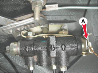 Регулятор давления жидкости в задних тормозных механизмах - регулировкаНеобходимость в регулировке регулятора давления возникает после его замены, замены пружин задней подвески или при неправильной работе тормозных механизмов задних колес. Для выполнения работы потребуются: - смотровая яма или эстакада - сверло или отрезок проволоки диаметром 2 мм - помощник. Регулировка 1. Подготавливаем автомобиль к выполнению работы (см. 5, п. 2б и 4). 2. Устанавливаем ненагруженный автомобиль на смотровую яму или эстакаду. 3. Несколько раз нажимаем на заднюю часть автомобиля для самоустановки подвески. 4. Измеряем зазор "А" между пластиной и рычагом (см. ниже), который должен составлять 2.0 - 2,1 мм. Если величина зазора не соответствует требуемому размеру - регулируем привод регулятора.
