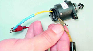 2. Если выступание клапана более 23 мм, то утапливаем клапан в корпус следующим образом: а) проводом соединяем положительный вывод аккумуляторной батареи с выводом D регулятора (соединение провода с выводом должно быть заизолировано); б) оголенным концом провода соединенным с отрицательным выводом аккумуляторной батареи, кратковременно касаемся вывода С колодки жгута. Поскольку, клапан движется очень медленно, касания выполняем многократно, воспроизводя работу импульсного источника питания.
