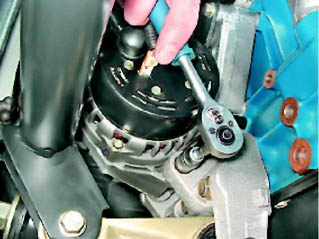 Предупреждение! Чрезмерное натяжение ремня может привести к выходу из строя переднего подшипника генератора. 6. Проверяем натяжение ремня регулятора и при необходимости повторяем регулировку. 7. Убедившись, что ремень натянут правильно, накидным ключом на 13 мм затягиваем гайку натяжной планки. 8. Торцовым ключом на 13 мм затягиваем гайку болта нижнего крепления генератора. |