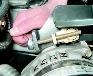 Ремень привода генератора - проверка и регулировка натяженияПоследовательность выполнения 1. Подготавливаем автомобиль к выполнению работы (см. 5, п. 2). 2. Нажимаем на ремень привода генератора с усилием 98 Н (10 кгс) точно посередине между шкивом генератора и шкивом коленчатого вала двигателя. Совет: Если трудно оценить усилие, создаваемое рукой, можно воспользоваться бытовым безменом с максимально допустимой нагрузкой 10 кг, так как это сделано при проверке ремня привода ГРМ (см. 8.18, п. 5). Правильно отрегулированный ремень должен прогнуться на 68 мм. Если прогиб ремня не соответствует норме, то регулируем натяжение ремня. Для этого: 3. Накидным или торцовым ключом на 13 мм ослабляем затяжку