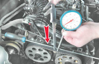 Ремень привода грм проверка состояния и регулировка натяженияЗамечание: Ремень привода газораспределительного механизма следует заменять через каждые 45 000 км пробега В процессе эксплуатации необходимо периодически проверять натяжение и техническое состояние зубчатого ремня. Для проверки натяжения необходим специальный индикатор. Но работу можно выполнить с достаточной точностью и без него. Ремень должен быть чистый - без следов грязи и масла на его поверхности. Ремень с надрывами, трещинами, расслоениями, срезанными или изношенными зубьями, потертостями до корда подлежит немедленной замене. Предупреждение! Регулировку ремня следует выполнять на холодном двигателе. Для выполнения работы потребуются: - ключ для натяжения ремня привода ГРМ; - штангенциркуль; - бытовой безмен. Зацепляем крючок безмена за рукоятку удлинителя торцового ключа. Изоляционной лентой или скотчем закрепляем крючок безмена на удлинителе.