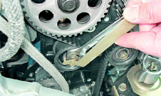 Замечание: На двигателе 2112 прогиб ремня можно измерять от кромки передней крышки (если она не снята). Предварительно необходимо определить расстояние от кромки крышки до ремня и учитывать этот размер при измерениях. Если прогиб ремня больше указанного - натягиваем ремень, если ремень перетянут - ослабляем его натяжение. Регулировка 1. Ключом на 17 мм ослабляем затяжку гайки крепления натяжного ролика. 2. Специальным ключом, поворачивая ролик, регулируем натяжение ремня. Не отпуская ролик, затягиваем гайку его крепления.