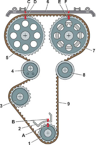 Схема привода распределительных валов: 1 - зубчатый шкив коленчатого вала двигателя; 2 - прилив на крышке масляного насоса; 3 - зубчатый шкив насоса охлаждающей жидкости; 4 натяжной ролик; 5 - зубчатый шкив распределительного вала выпускных клапанов; 6 - задняя крышка ремня ГРМ; 7 - зубчатый шкив распределительного вала впускных клапанов; 8 направляющий ролик; 9 - зубчатый ремень; A - метка ВМТ на зубчатом шкиве коленчатого вала; B - метка на крышке масляного насоса; C, F - метка на задней крышке ремня ГРМ; D метка на зубчатом шкиве распределительного вала выпускных клапанов; E метка на зубчатом шкиве распределительного вала впускных клапанов Снятие 1. Подготавливаем автомобиль к выполнению работы (см. 5, п. 2б и 4, с. 24, 25). 2. Снимаем шкив коленчатого вала (см. 8.1.6). 3. Снимаем переднюю крышку ремня привода ГРМ (см. 8.1.7) и помечаем направление вращения ремня. 4. Устанавливаем на место болт крепления шкива коленчатого вала. 5. Проворачивая коленчатый вал торцовым ключом на 17 мм за болт крепления шкива, устанавливаем поршень первого цилиндра в положение ВМТ такта сжатия. При этом метки шкивов коленчатого вала и распределительных валов совместятся с установочными метками на корпусе масляного насоса и задней крышки ремня привода ГРМ.