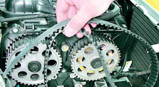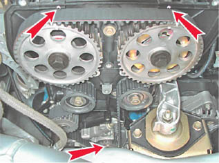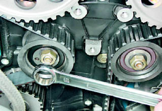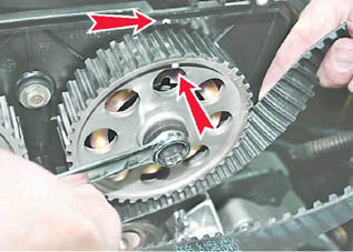 Удерживая шкив в этом положении, накидываем ремень на его верхнюю часть, не допуская провисания ремня между шкивами и его перескакивания по зубьям шкива впускных клапанов. 5. Поворачивая шкивы ключом на 17 мм, натягиваем правую ветвь ремня, не допуская поворачивания шкива коленчатого вала и полностью одеваем ремень на шкив распределительного вала выпускных клапанов.
