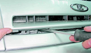 3. Слегка приподнимаем решетку и отверткой освобождаем два фиксатора нижнего крепления решетки с левой и правой сторон.