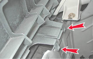 Устанавливаем решетку радиатора в обратной последовательности, убедившись, что пружинящие лепестки фиксаторов нижнего крепления решетки вошли в зацепление с отбортовкой поперечины кузова.