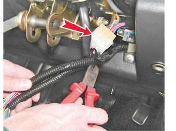 Рулевая колонка в сборе - снятие и установкаСнятие 1. Подготавливаем автомобиль к выполнению работы (см. 5, п. 2а). 2. Снимаем рулевое колесо (см. 11.1). 3. Снимаем декоративные накладки рулевой колонки (см. 11.2). 4. Снимаем правый и левый подрулевые переключатели вместе с соединителем (см. 13.5.2). 5. Кусачками перекусываем стяжной хомут трех жгутов проводов и разъединяем колодки жгута проводов замка зажигания.