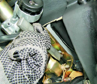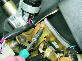 9. Окончательно отворачиваем специальные болты плоскогубцами и снимаем их вместе с фиксирующими пластинами. 10. Торцовым ключом с глубокой головкой на 13 мм отворачиваем две гайки заднего крепления рулевой колонки.