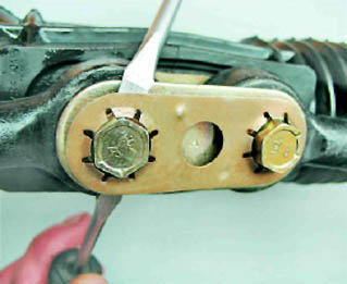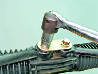 Предупреждение! Правая и левая тяги не взаимозаменяемы. 5. Торцовым ключом на 15 мм отворачиваем болты крепления тяг к рейке рулевого механизма.