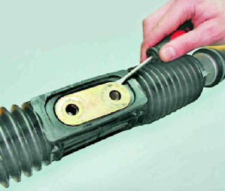 Рулевые тяги - снятие и установкаСнятие 1. Снимаем брызговик двигателя (см. 14.1.12). 2. Снимаем защитный экран рулевого механизма (см. 8.5.5, п. 5 и 6). 3. Выпрессовываем пальцы шаровых шарниров тяг из поворотных рычагов стоек передней подвески (см. 11.6, п. 4-6). 4. Поддев двумя шлицевыми отвертками, снимаем стопорную пружинную пластину болтов крепления тяг к рейке (для лучшей видимости показано на снятом рулевом механизме).