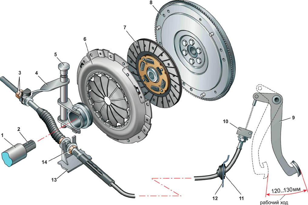 Сцепление: 1 - направляющая втулка выжимного подшипника; 2 - первичный вал коробки передач; 3 - регулировочные гайки троса; 4 - вилка выключения сцепления; 5 - втулка оси вилки; 6 - нажимной диск в сборе (корзина); 7 - ведомый диск; 8 - маховик двигателя; 9 - педаль сцепления; 10 - кронштейн оболочки троса; 11 - пыльник; 12 - перегородка моторного отсека; 13 - кронштейн на картере коробки передач; 14 - гайки крепления оболочки тросаМуфта выжимного подшипника надета на направляющую втулку и пружиной прижата к вилке выключения сцепления. При повороте вилки происходит продольное перемещение выжимного подшипника по направляющей втулке. Выжимной подшипник постоянно прижат к лепесткам диафрагменной нажимной пружины и вращается вместе с ней. При включенном сцеплении его ведущая и ведомая части вращаются как одно целое, передавая крутящий момент от коленчатого вала двигателя на первичный вал коробки передач. При нажатии педали сцепления вилка выключения сцепления, поворачиваясь, перемещает выжимной подшипник с его муфтой по направляющей втулке. Подшипник воздействует на диафрагменную пружину, которая прогибаясь, отводит нажимной диск от ведомого и передача крутящего момента прекращается. При отпускании педали все детали сцепления под действием пружин возвращаются в исходное положение. Регулировка привода сцепления (хода педали) осуществляется путем изменения положения нижнего наконечника оболочки троса в кронштейне его крепления. На автомобилях с двигателями 2112 (1,5i) и 21124 (1,6i) устанавливаются ведущий и нажимной диски не взаимозаменяемые с другими переднеприводными моделями ВАЗа. Отличить их можно по отверстию между лепестками диафрагменной пружины...