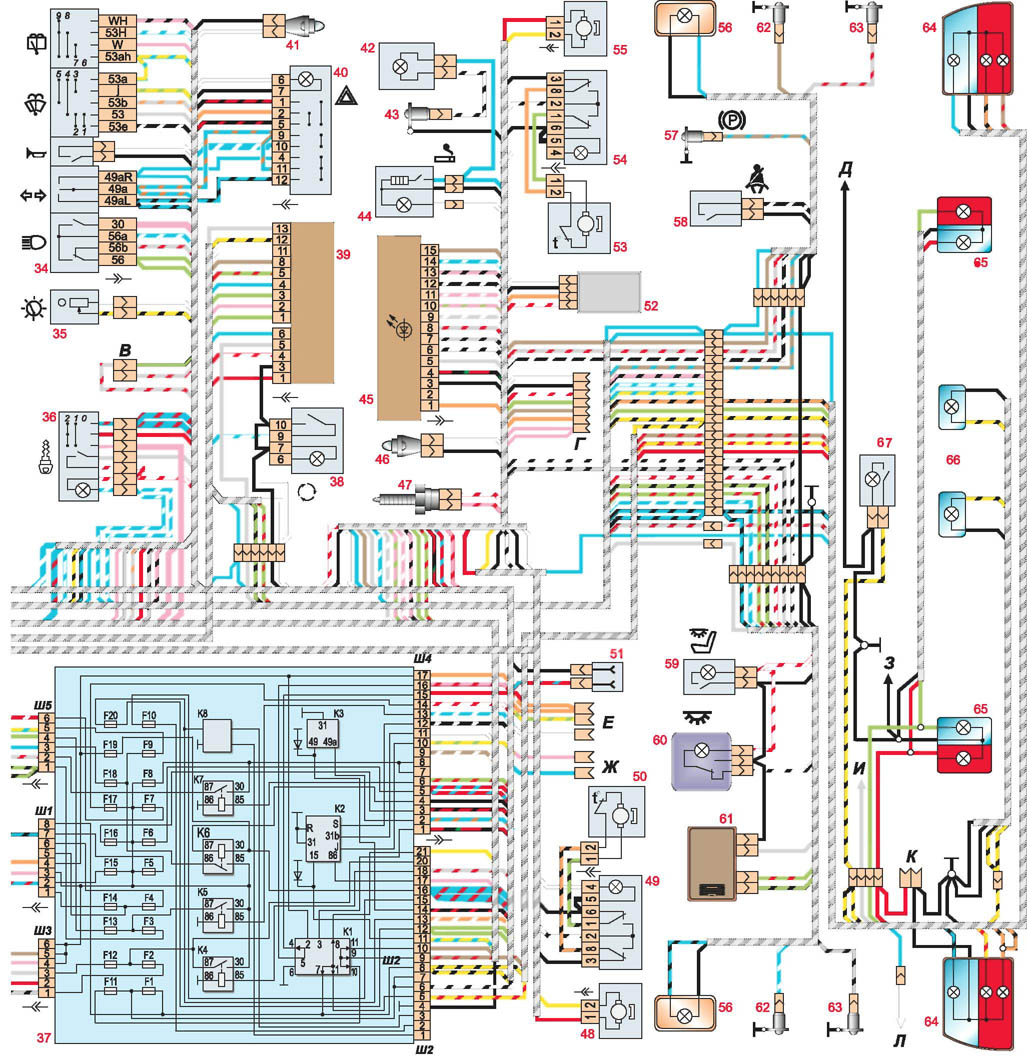 44 - прикуриватель; 45 - блок бортовой индикации системы контроля; 46 - лампа подсветки пепельницы; 47 - выключатель сигнала торможения; 48 - мотор-редуктор блокировки замка левой задней двери*; 49 - выключатель стеклоподъемника левой задней двери*; 50 - мотор-редуктор стеклоподъемника левой задней двери*; 51 - розетка для переносной лампы; 52 - часы; 53 - мотор-редуктор стеклоподъемника правой задней двери; 54 - выключатель стеклоподъемника правой задней двери*; 55 - мотор-редуктор замка правой задней двери*; 56 - боковые указатели поворота; 57 - выключатель контрольной лампы стояночного тормоза; 58 - датчик непристегнутого ремня безопасности*; 59 - фонарь индивидуальной подсветки; 60 - плафон освещения салона; 61 - датчик температуры воздуха в салоне; 62, 63 - выключатели лампы освещения салона; 64 - задние фонари (наружные); 65 - задние фонари (внутренние); 66 - фонари освещения номерного знака; 67 - плафон освещения багажного отделения; А - колодки для подключения электронасоса омывателя заднего стекла (для автомобилей с кузовами хэтчбек и универсал); Б - колодка для подключения жгута проводов системы управления двигателем; В - колодки для переключения проводов при установке блок-фар другого типа; Г - колодка для подключения маршрутного компьютера; Д, И - к элементу обогрева заднего стекла; Е - колодки для подключения очистителя фар*; Ж - колодки для подключения к топливному модулю (к датчику указателя уровня топлива); 3, Л - к мотор-редуктору электропривода замка двери (крышки) багажного отделения*; К - к фонарю дополнительного сигнала торможения Примечание. Схема электрооборудования автомобиля (в зависимости от года выпуска и комплектации) может по цветам некоторых проводов и количеству дополнительного оборудования отличаться от представленной схемы. * Устанавливается на части автомобилей. |