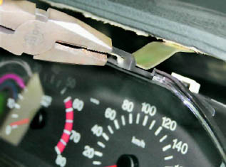 4. Пассатижами, аккуратно, так, чтобы не повредить пластмассовые петли щитка приборов, отгибаем