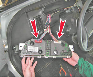 6. Вынимаем щиток из проема панели приборов и отсоединяем две колодки жгутов проводов.
