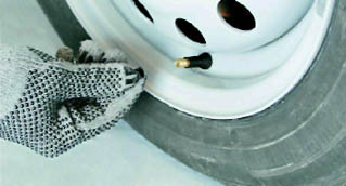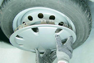 Шины - проверка давленияДавление воздуха в шине автомобиля не постоянно. При повышении температуры окружающего воздуха давление в шине возрастает, а при понижении - падает. При небольших колебаниях температуры окружающего воздуха давление в шине меняется незначительно. Если перепад температур достигает 10-15 °С, то необходимо проверить и, при необходимости, довести давление в шинах до нормы. Изменяется давление в шине и во время движения автомобиля с большой скоростью и частыми маневрами. Зимой это практически незаметно. Холодный воздух и низкая температура покрытия дороги не позволяют шине нагреться. В летний период набегающий поток теплого воздуха плохо охлаждает шину, и ее температура начинает повышаться. Дополнительный нагрев шины происходит от разогретого солнечными лучами покрытия дороги. Все это может повысить давление в шине на 0,2-0,3 бар. Предупреждение: Давление в шине измеряется только если ее температура равна температуре окружающего воздуха. Для выполнения работы потребуются: - манометр; - компрессор или шинный насос. Последовательность выполнения 1. Подготавливаем автомобиль к выполнению работы (см. 5, п. 2а). 2. Потянув на себя, снимаем декоративный колпак колеса.