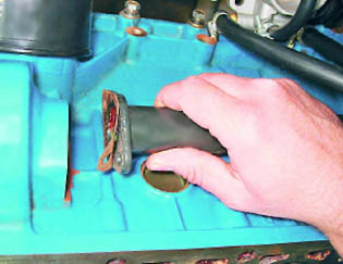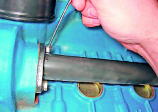 16. Ослабив затяжку хомута, снимаем шланг вентиляции картера с патрубка блока цилиндров.