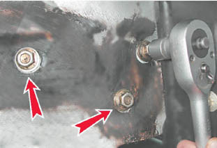 26. Торцовым ключом на 15 мм под правым передним крылом автомобиля отворачиваем три болта крепления кронштейна опоры к правому лонжерону.