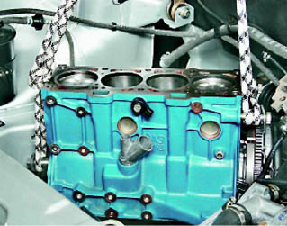 28. Слегка покачивая блок цилиндров, отсоединяем его от коробки передач и вынимаем из моторного отсека.