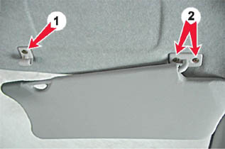 3. Крестовой отверткой отворачиваем саморез крепления фиксатора козырька (1) и два самореза крепления кронштейна козырька (2).