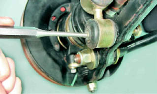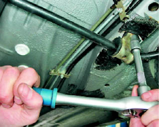 Так же вынимаем болт соединения стойки стабилизатора с правым рычагом подвески. 5. Торцовым ключом на 13 мм с коротким удлинителем отворачиваем две гайки крепления скобы левой подушки штанги стабилизатора к кузову.