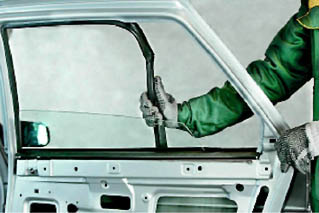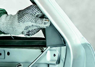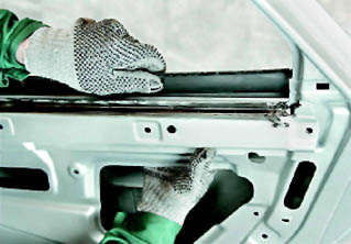 Стекло двери - снятие и установкаСнятие 1. Снимаем обивку двери (см. 14.3.1. с. 235). 2. Снимаем стеклоподъемник (см. 14.3.4). Замечание: Выполняя следующую операцию, не используйте отвертку как рычаг. 4. Шлицевую отвертку с широким лезвием подсовываем под декоративную накладку (накладка крепится на одном пружинящем зажиме, расположенном на ее внутренней стороне по центру). Повернув отвертку вокруг ее оси, снимаем накладку с двери.