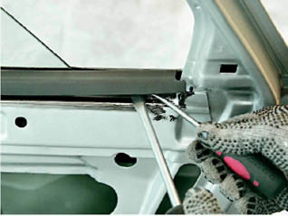 6. Двумя шлицевыми отвертками снимаем внутренний нижний уплотнитель стекла, начиная с заднего конца. Отверткой с тонким лезвием отжимаем нижнюю грань уплотнителя и выводим ее из зацепления с панелью двери. Одновременно, отверткой с широким лезвием приподнимаем уплотнитель, не давая ему зацепиться.