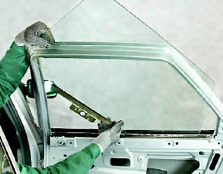 7. Извлекаем стекло через проем между наружной и внутренней панелями двери.