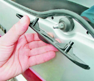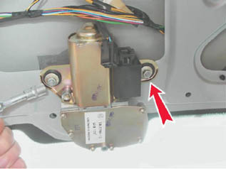 Установка Устанавливаем мотор-редуктор и снятые детали в обратной последовательности. Распорные стержни забиваем в отверстия декоративной накладки очистителя с лицевой стороны двери. |