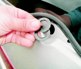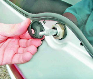 15. С наружной стороны двери снимаем пластмассовую шайбу и резиновую уплотнительную прокладку.