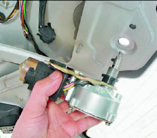 Стеклоочиститель - снятие и установкаСнятие 1. Подготавливаем автомобиль к выполнению работы (см. 5, п. 1, 2 и 4). 2. Снимаем клемму провода с отрицательного вывода аккумуляторной батареи (см. 13.3.4, п. 2). 3. Снимаем обивку двери (см. 14.7.3). 4. Сжав фиксаторы, отсоединяем колодку проводов от мотор-редуктора стеклоочистителя.