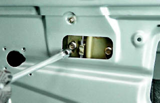4. Надев ручку стеклоподъемника на вал механизма привода, опускаем стекло так, чтобы болты крепления кронштейна стекла совпали с проемом во внутренней панели двери. Торцовым ключом на 10 мм с удлинителем ослабляем затяжку болтов крепления кронштейна стекла к направляющей стеклоподъемника. Затем, придерживая стекло, полностью отворачиваем болты крепления стекла, после чего опускаем стекло вниз.