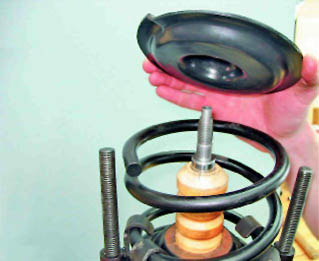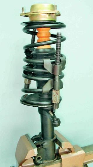 Стойка передней подвески - разборка и сборкаДля выполнения работы потребуются: - стяжки пружин; - специальные приспособления для разборки стойки подвески (см. 4.2, п. 44). Разборка 1. Снимаем стойку с автомобиля (см. 10.1.2). 2. Зажимаем стойку в тисках, как показано на фотографии. Предупреждение! Соблюдайте осторожность! Сжатая пружина обладает большой силой и при срыве стяжки, распрямляясь, может нанести травму. 3. Устанавливаем с противоположных сторон пружины стяжки и равномерно, без перекосов стягиваем пружину до снятия нагрузки с верхней чашки пружины.