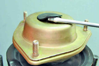 4. Поддев шлицевой отверткой, вынимаем резиновую заглушку из отверстия в корпусе верхней опоры стойки.